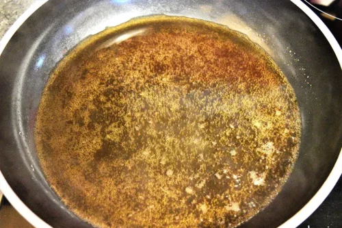 - In einer beschichteten Pfanne den braunen Zucker karamellisieren und mit dem Wasser, dem Haselnusslikör und dem Saft der Limette ablöschen.