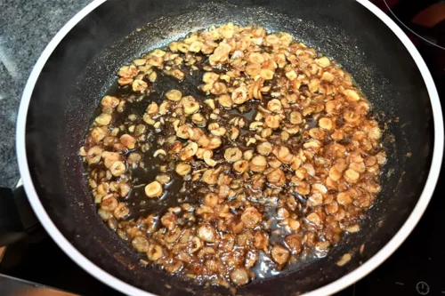 - Etwas reduzieren lassen, die gehobelten Haselnüsse unterrühren und 2-3 min in dem Karamell ziehen lassen.