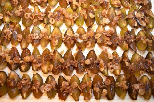 - Den Backofen auf 180°C (Umluft 160°C) vorheizen und das Haselnuss Karamell über die Zwetschgen verteilen.