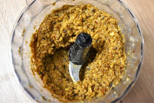 - Anstatt einen Zerkleinerer zu nutzen, kann man das Trockenobst auch durch einen Fleischwolf drehen.