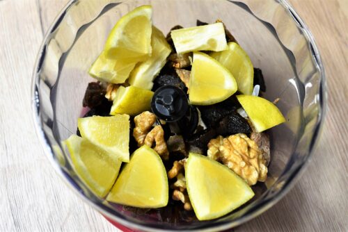 - Den Zitronensaft und die geschnittene Zitrone ebenfalls zugeben und die Zutaten zu einer feinen homogenen Masse zerkleinern.3 Zitronen