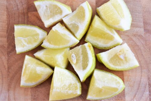 - Eine Zitrone waschen und in kleine Stücke schneiden.3 Zitronen