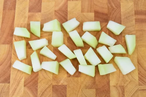 - Die Melone in Stücke teilen, schälen und in Würfel schneiden. Die Würfel sollten mundgerecht sein.600 g Honigmelone
