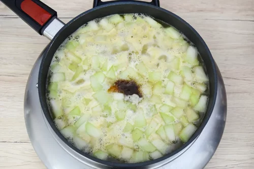 - Den Kompott bei kleiner Hitze noch 15 bis 20 Minuten leise köcheln lassen. Die Zeit ist von der gewünschten Konsistenz, der gewünschten Bissfestigkeit der Melonenstücke und der erforderlichen Soßenmenge abhängig.