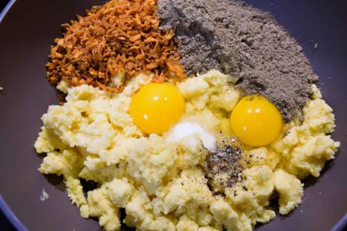 - Die Kartoffelpüree Reste vom Vortag, es kann auch Kartoffelstampf sein, in eine Schüssel geben. Die Eier, die Röstzwiebel, Salz und Pfeffer sowie das Sonnenblumenkernmehl ebenfalls in diese Schüssel geben.900 g Kartoffelpüree, 50 g geröstete Zwiebel, 2 Eier, ½ TL Salz, ½ TL Pfeffer, 30 g Sonnenblumenkernmehl