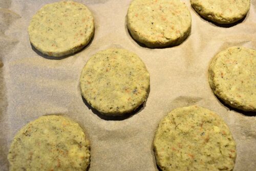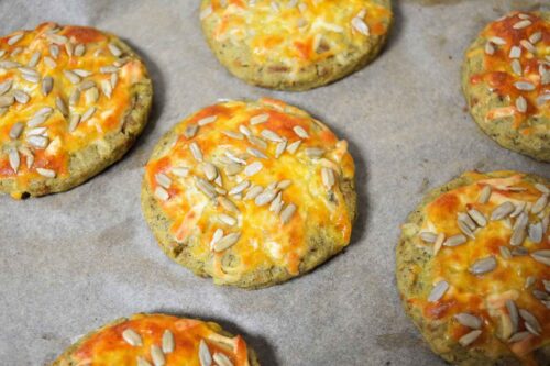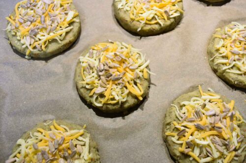 - Die fertig geformten Taler mit Käse und Sonnenblumenkernen bestreuen.100 g Käse, 3 EL Sonnenblumenkerne