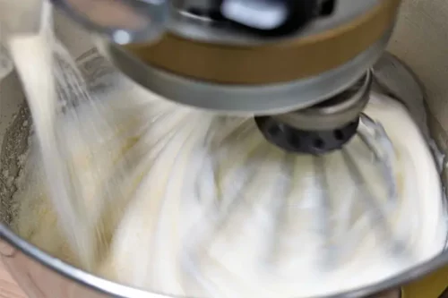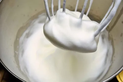 - Den Zuckerlangsam in den Eischnee einstreuen, dabei die Maschine auf der kleinsten Stufe weiter schlagen lassen. Solange schlagen, bis sich der Zucker aufgelöst hat.