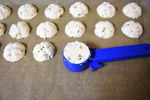 - Ein Backblech mit Backpapier belegen. Mit Hilfe eines Makronen Formers die Teigmasse portionsweise auf das Backpapier (mit oder ohne Back Oblaten) setzen.