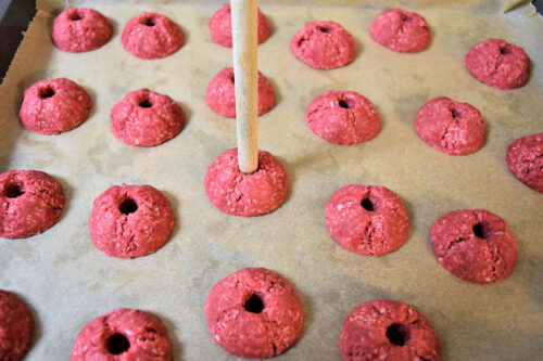 - Mit einem Kochlöffelstiel in jede Makrone ein Loch von höchstens 1 cm Tiefe drücken.
