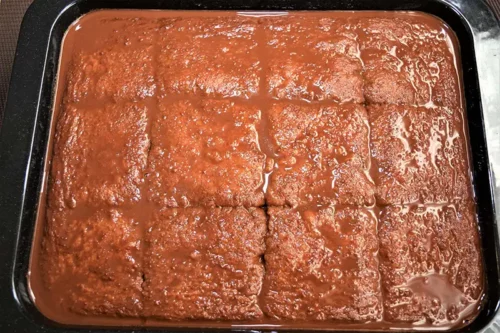 Dieser Kokos Schoko Kuchen ist ein echtes Familienerbe aus Mazedonien – einfach, saftig und unwiderstehlich aromatisch. Die Kombination aus fluffigem Teig, Kokosflocken, feiner Vanillenote und einer dunklen Kakaoglasur sorgt für einen intensiven, aber ausgewogenen Geschmack. Durch das langsame Durchziehen der Glasur wird der Kuchen besonders saftig und entwickelt über Nacht sein volles Aroma.