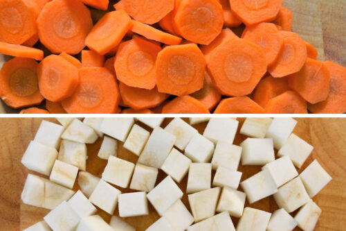 - Die Möhren und den Knollensellerie schälen und in Stücke schneiden.2 Möhren, 150 g Sellerie