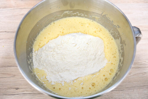 - Die Mehlmischung zugeben und mit den flüssigen Zutaten zu einer glatten Teigmasse verrühren.