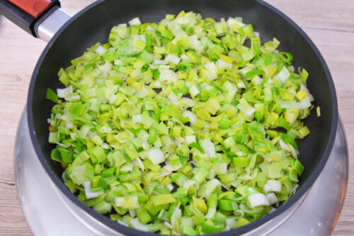 - Den Porree mit 2 EL Öl in einer Pfanne kurz anbraten und dann zur Seite stellen.2 EL Öl