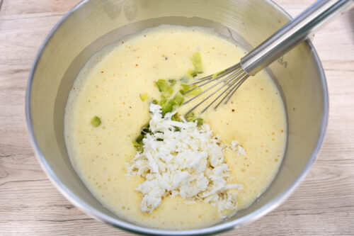 - Den angebratenen Lauch und den geriebenen Feta hinzufügen und miteinander vermischen.