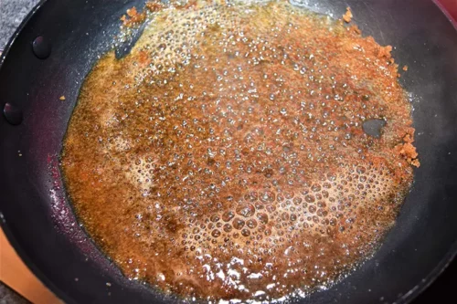 - In einer Pfanne die Butter mit dem braunen Zucker karamellisieren.