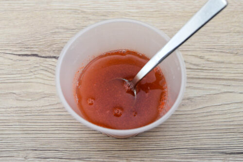- Paprikapulver, Salz und Wasser in einen Becher oder eine kleine Schüssel geben und miteinander verrühren. Das Salz sollte sich komplett aufgelöst haben.