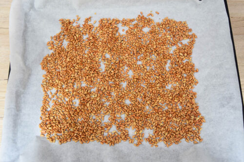 - Nach Ablauf der Backzeit die Kerne zum Abkühlen auf ein mit Backpapier ausgelegtes Blech legen. Die Sonnenblumenkerne großzügig auf dem Blech verteilen, damit sie nicht zusammenkleben und schneller kalt werden.