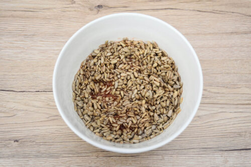 - Die Sonnenblumenkerne in eine Schüssel geben, mit der Wasser-Paprika-Mischung übergießen. Alles vermischen und rund 15 min ziehen lassen.