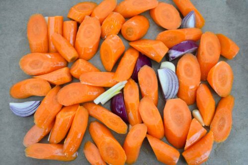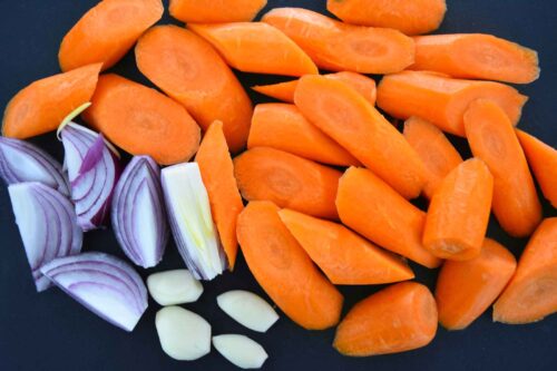 - Die Möhren schälen, waschen und schräg in große Stücke schneiden. Durch den Schrägschnitt vergrößert sich die Oberfläche und dies ist vorteilhaft beim Rösten. Die Knoblauchzehen schälen und ganz lassen. Die Zwiebel schälen und in grobe Stücke schneiden.
