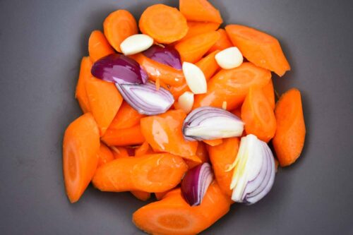 - Karotten, Zwiebel und Knoblauch in eine Schüssel geben, mit dem Olivenöl beträufeln und alles miteinander vermischen.
