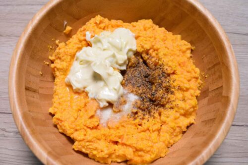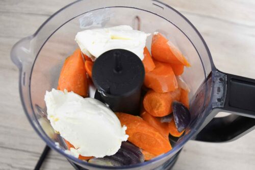 - Die abgekühlten Gemüse und alle anderen Zutaten, außer der Mayonnaise, in einen Mixer geben und alles zu einem wunderbaren Dip durchmixen. Je länger die Mix Zeit, desto sämiger die Konsistenz des Dips.