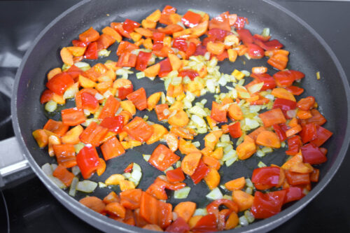 - In eine Pfanne das Olivenöl geben, erhitzen und Zwiebel, Möhre und Paprika anbraten.1 Paprika, 1 Zwiebel, 1 Möhre, 2 EL Olivenöl