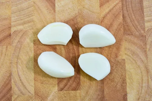 - Die Knoblauchzehen schälen und diese ganz lassen.4 Zehen Knoblauch