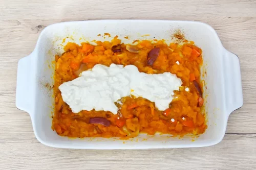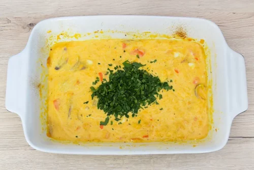 - Die Auflaufform aus dem Ofen nehmen und auf eine hitzefeste Unterlage abstellen. Das geröstete Gemüse mit einer Gabel oder einem Kartoffelstampfer grob zerdrücken. Es dürfen ruhig Stücke in der Soße bleiben.
