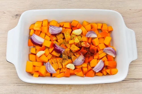 - Die Kürbis Stücke in eine Auflaufform geben, Zwiebel und Knoblauch dazugeben. Mit Olivenöl beträufeln und mit Gemüsebrühe, Salz und Pfeffer würzen. Wer mag gibt noch Chiliflocken hinzu. Alles vermischen und für 30 bis 35 Minuten in den vorgeheizten Ofen geben.350-400 g Kürbis, 1 Zwiebel, 4 Zehen Knoblauch, 2-3 EL Olivenöl, 1 TL Gemüsebrühe, ½ TL Salz, 1 Prise Pfeffer, Chiliflocken