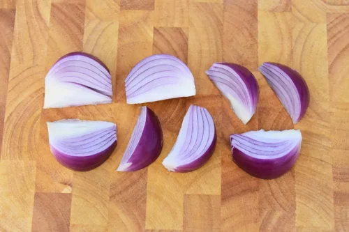 - Die Zwiebel schälen und vierteln, sollte sie etwas größer sein bitte achteln.1 Zwiebel