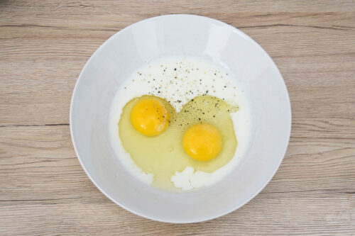 - Kommen wir jetzt zu der Toast Zubereitung. Dazu die Eier mit der Milch und je einer Prise Salz und Pfeffer in einen Teller geben und mit einer Gabel gut verrühren oder aufschlagen.2 Eier, 5 EL Milch, 1 Prise Salz, 1 Prise Pfeffer