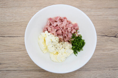 - Für die Füllung den Frischkäse in eine Schüssel geben und mit je einer Prise Salz und Pfeffer würzen. Den Schinken in kleine Stückchen schneiden, je feiner, desto besser, und auch in die Schüssel geben. Den Schnittlauch waschen, verlesen und in feine Röhrchen schneiden, Diese ebenfalls in die Schüssel geben und alle Zutaten zu einer homogenen Creme vermischen.150 g Frischkäse, 2 Scheiben gekochter Schinken, 2-3 EL Schnittlauch, 1 Prise Pfeffer, 1 Prise Salz