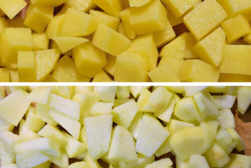 - Kartoffeln und den Apfel schälen, in kleine Würfel schneiden und in luftdicht verschließende Dosen geben -siehe Notiz-.150 g Kartoffeln, 1 Apfel