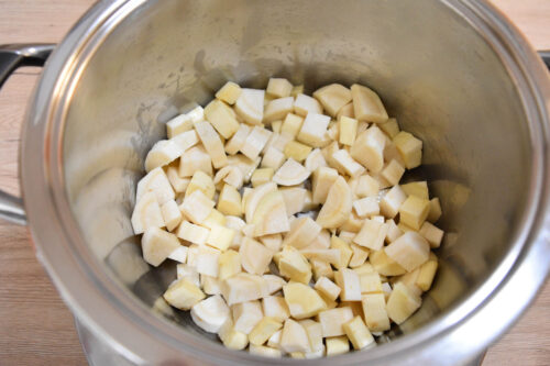 - Pastinaken und Sellerie schälen und in kleine Würfel schneiden.500 g Pastinaken, 50 g Knollensellerie
