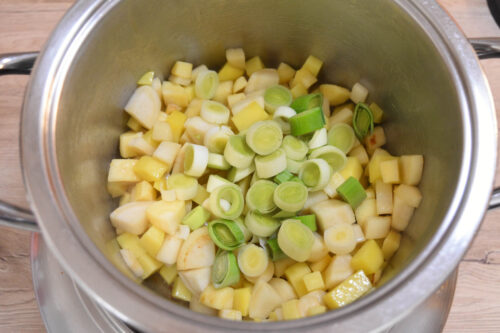 - Lauch dazugeben und kurz anbraten.
