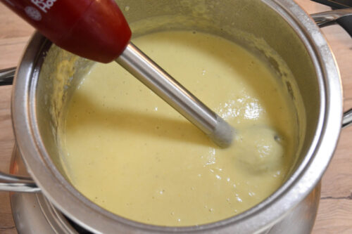 - Nach der Garzeit die Sahne zugeben und mit einem Pürierstab die Suppe zu einer Cremesuppe aufmixen.200 ml Sahne