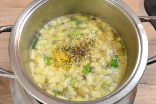 - Das kochende Wasser und die Gewürze zugeben, vermischen und die Suppe bei mittlerer Hitze in rund 20 min garkochen.1300 ml Wasser, 1 TL Salz, 1 TL Gemüsebrüh, ½ TL Pfeffer
