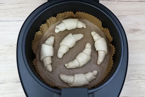 - Das fertige Croissant in den Einsatz der Heißluftfritteuse legen. Siehe auch oben im Text. Anschließend die Croissants 2 bis 6 fertigen und in den Korb des Airfryer geben. Die Oberseite der Croissants mit Wasser einpinseln und diese dann bei 180°C (Stufe 3) für circa 12 Minuten backen oder frittieren.