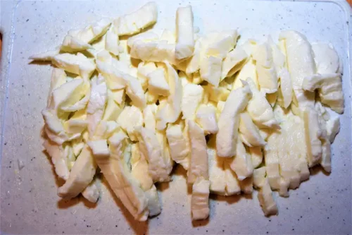 - In der Zwischenzeit den Käse reiben und den Mozzarella in kleine Streifen schneiden.