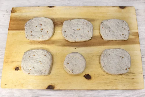 - Die Brötchen Packung öffnen, die Brötchen entnehmen und auf einer Arbeitsplatte ablegen. Mit den Fingern in eine rechteckige Form bringen, weil der Käse, den ich benutze, rechteckig ist.1 P Knack & Back Sonntagsbrötchen
