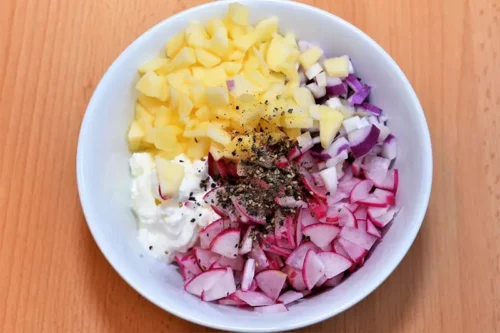 - Den Frischkäse und den Quark in eine Schüssel geben. Die Radieschen, die Zwiebel und den Apfel in kleine Stücke schneiden und zu dem Käse in die Schüssel geben, den Limettensaft noch dazugeben und alles miteinander vermischen.100 g Frischkäse, 100 g Quark, 6 Radieschen, 1 Apfel, 1 Zwiebel, 1 TL Limettensaft