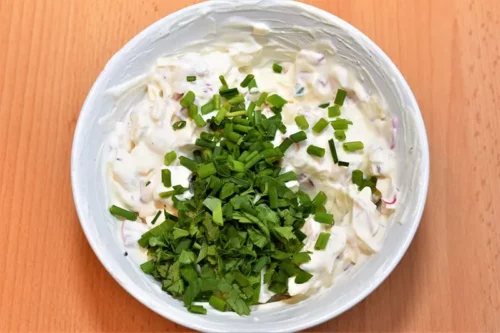 - Die Petersilie und den Schnittlauch klein schneiden und zu dem Dip geben, mit Salz und Pfeffer würzen und einarbeiten.2 EL Schnittlauch, 2 EL Petersilie, 1 TL Salz, 1 TL Pfeffer