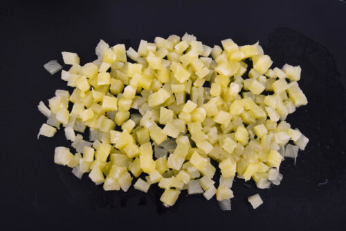- Die Ananasdose öffnen und den Inhalt durch ein Sieb in eine Schüssel schütten. Die Ananasscheiben abtropfen lassen und den Saft zur Seite stellen. 5 Ananasscheiben in sehr kleine Würfel schneiden und die restlichen Scheiben zur Seite stellen.1 Dose Ananas