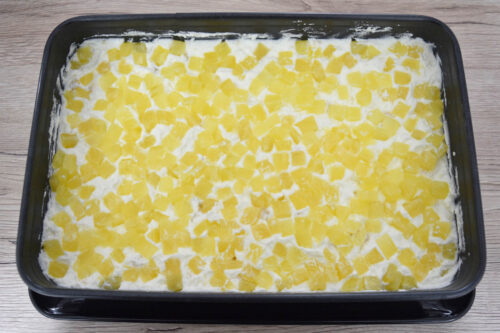 - Die kleingeschnittenen Ananaswürfel über die Creme verteilen.