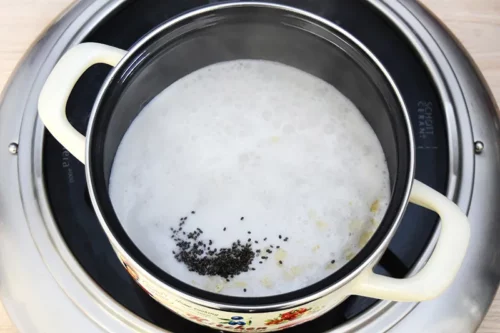 - In einem kleinen Topf die Kokosmilch geben und zum Kochen bringen. In die kochende Milch die Reisflocken, die Chia Samen und die Prise Salz einstreuen und unter gelegentlichem Rühren und bei mittlerer Hitze rund 5 Minuten köcheln lassen.5 EL Reisflocken, 300 ml Kokosmilch, 1 Prise Salz, 1 TL Chia Samen