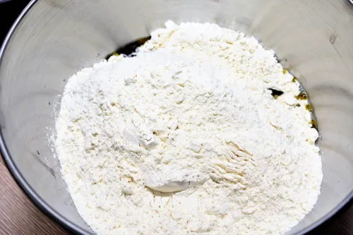 - Die Mehl-Hefe-Mischung in die Rührschüssel mit der Wasser-Mischung geben und alles zu einem homogenen Teig kneten oder kneten lassen.