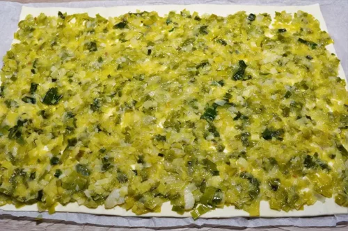 - In der Zwischenzeit die 2. Packung Teig ausrollen und mit dem restlichen Lauch bestreichen.