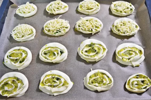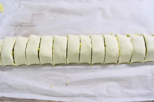- Den Teig aufrollen und auch in 16 Scheiben schneiden und auf ein mit Backpapier ausgelegtes Backblech legen.