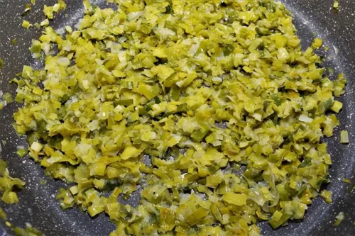 - Lauch und Öl in eine Pfanne geben und anbraten. Wenn der Lauch fast weich ist, mit Salz würzen, abschmecken und noch etwas weiterbraten.1-2 TL Salz