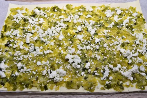 - Ein Paket Blätterteig auf der Arbeitsplatte ausrollen. Die Hälfte des Lauchgemüses auf dem Teig verteilen und darüber den Feta Käse zerbröseln.